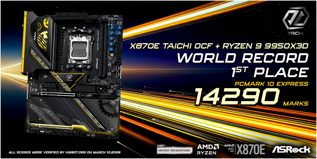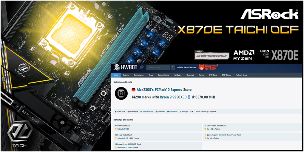 Professional overclocker Alex2305 successfully pushed system performance to a new level using the ASRock X870E Taichi OCF paired with the powerful AMD Ryzen™9 9950X3D processor, achieving an incredible PCMark10 Express score of 14290 marks, securing the World Record 1st Place on HWBOT.org.